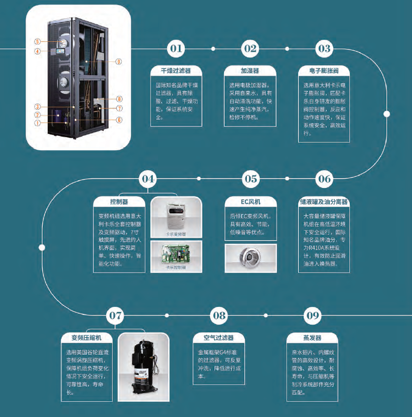機組可配置多組溫度傳感器,可實時檢測空調(diào)或服務(wù)器機柜不同位置的溫度,確保最佳的制冷效果;